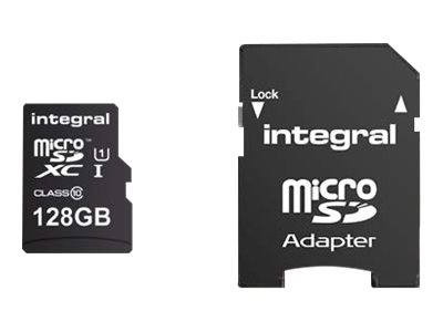 Description du produit Integral UltimaPro - carte mémoire flash - 128 Go - microSDXC UHS-I Type du Produit Carte mémoire flash Format Carte mémoire microSDXC UHS-I Capacité de stockage 128 Go Indice de vitesse UHS Class 1 / Class10 Adaptateur mémoire fourni Adaptateur microSDXC vers SD Garantie du fabricant Garantie de 5 ans -